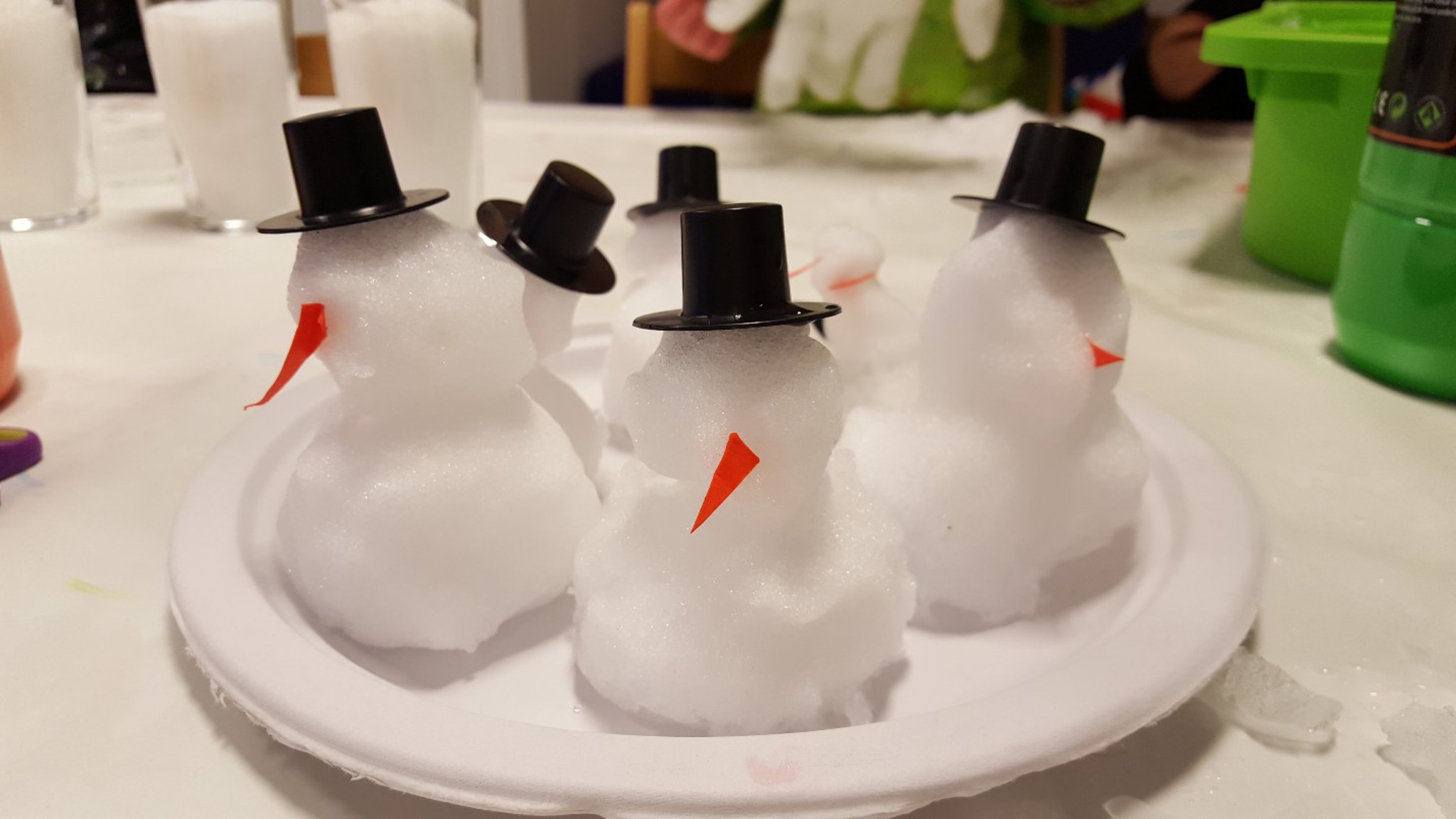 Det produseres mange snømenn i barnehagen, og de lages i mange varianter.. Når det ikke er så lett å lage de i snøen ute, så kan vi gjøre som Perlen har gjort, å ta snøen inn!