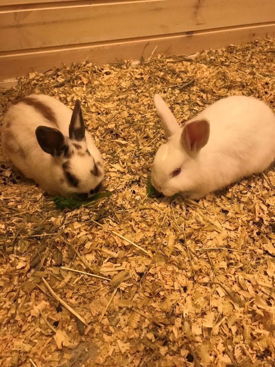 I høstferien flyttet disse to skjønne kaninene inn på tunet. Endelig har de fått navn. Barna på Gullklumpen har kommet med forslag og hatt avstemning. Den med brunt heter Brunflekken og den hvite har fått navnet Amelia.