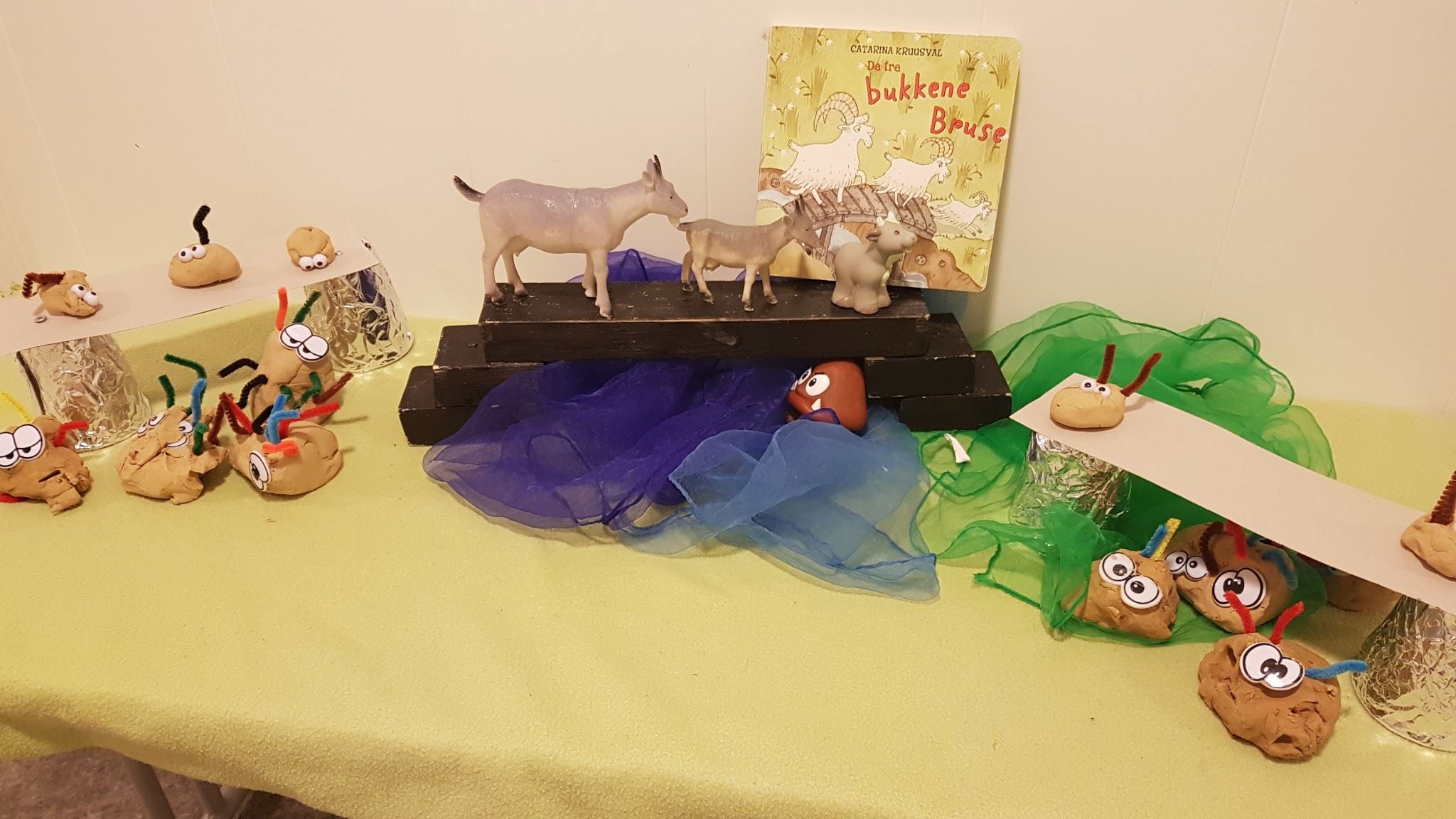 Barna på småbarn hatt om historien bukkende bruse og har laget bukker i leire. Hele familien står flott til utstilling i gangen.