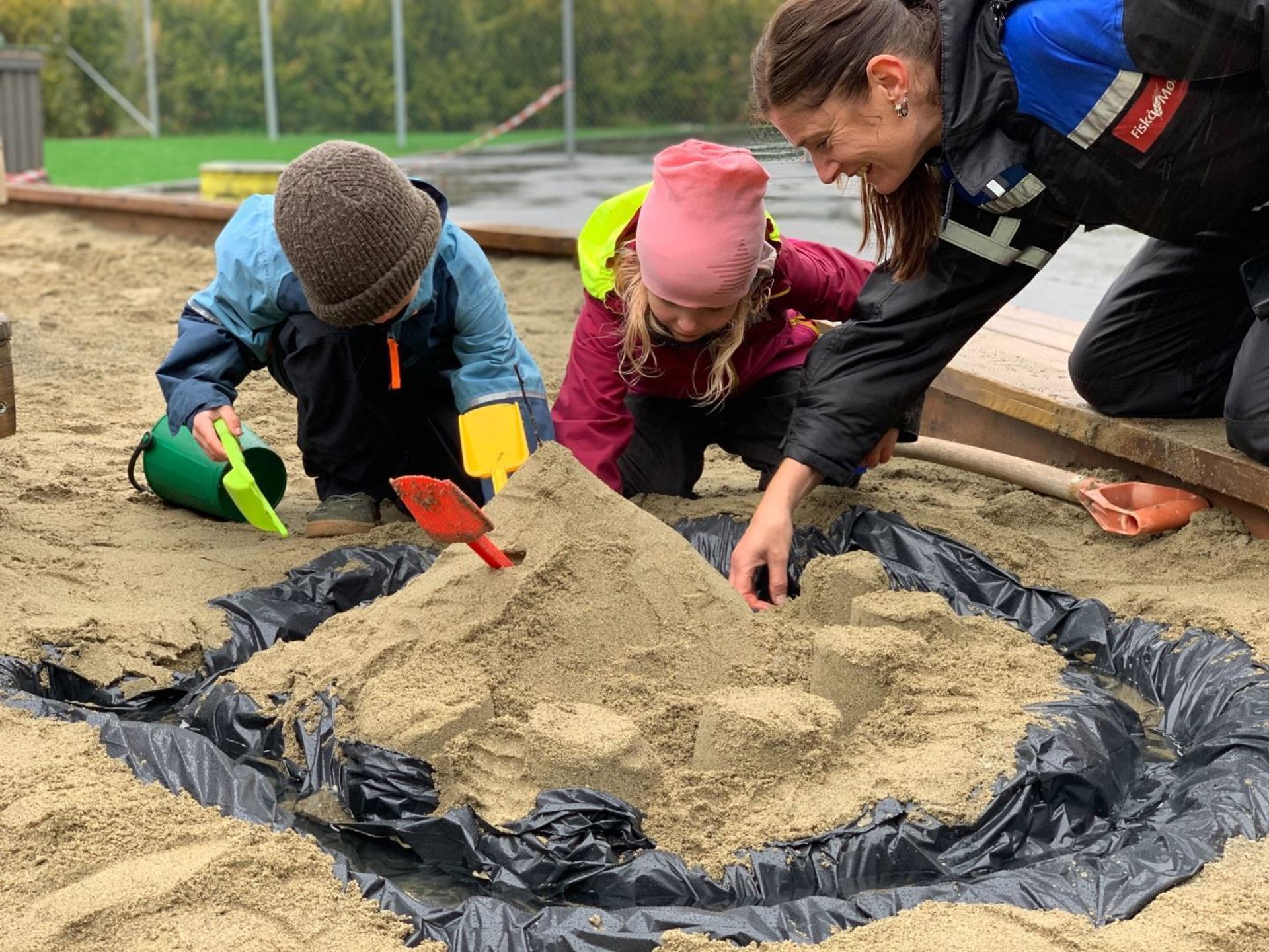 De siste årene har barnehagen vært med i prosjekt inkluderende barnehage og skolemiljø, hvir vi har hat ekstra fokus på leken. Nå i disse koronatidene, blir vi ekstra utfordret på å være kreative når vi bare får være på en liten del av uteområdet til dagen. Her har de voksne vært med og laget vanngrav med søppelsekker, for å legge tilrette for en fantastisk vannlek for barna.