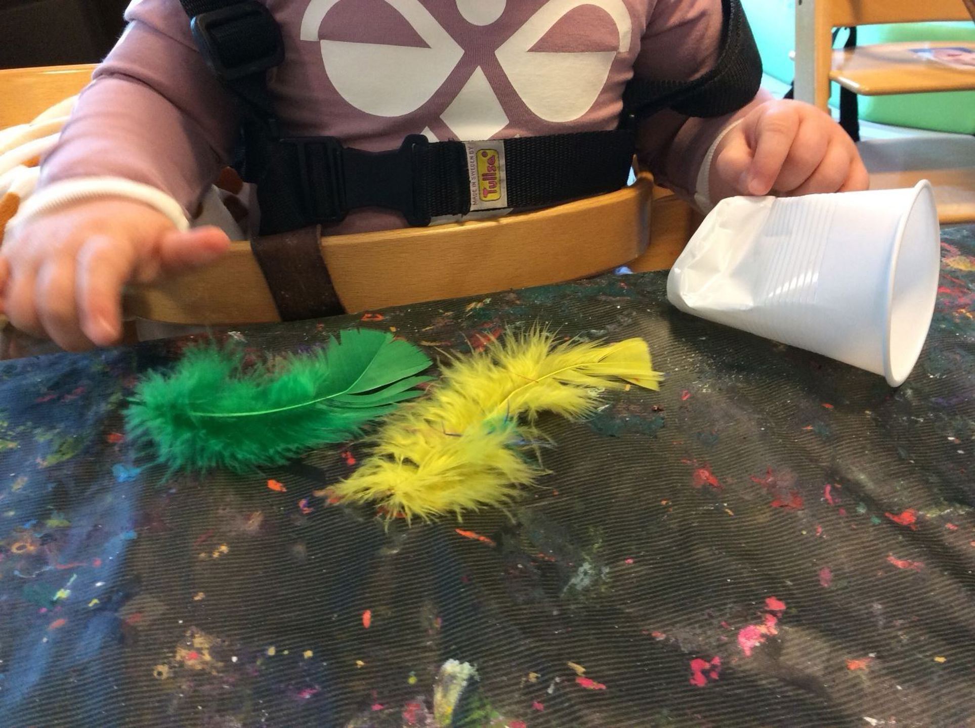 Gjennom skapende aktiviteter får barna erfare ulike materiell, ved å se, smake og føle. Er dette mykt eller hardt? Er det forskjell på hvordan en plastkopp og en fjær føles i hånden?