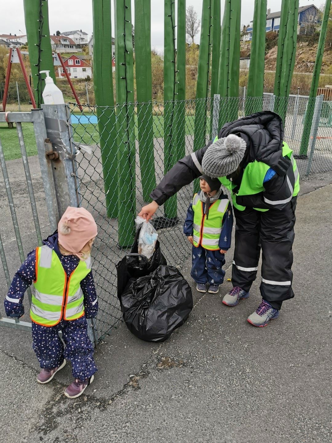 Ut på tur med søppelposer, engangshansker og godt pågangsmot en mandag formiddag. Hver avdeling hadde fått sitt område de skulle rydde - og vi fanmt mye rart! Pølsepose, munnbind, snopepapir og annet rusk og rask som ikke hører til i naturen.